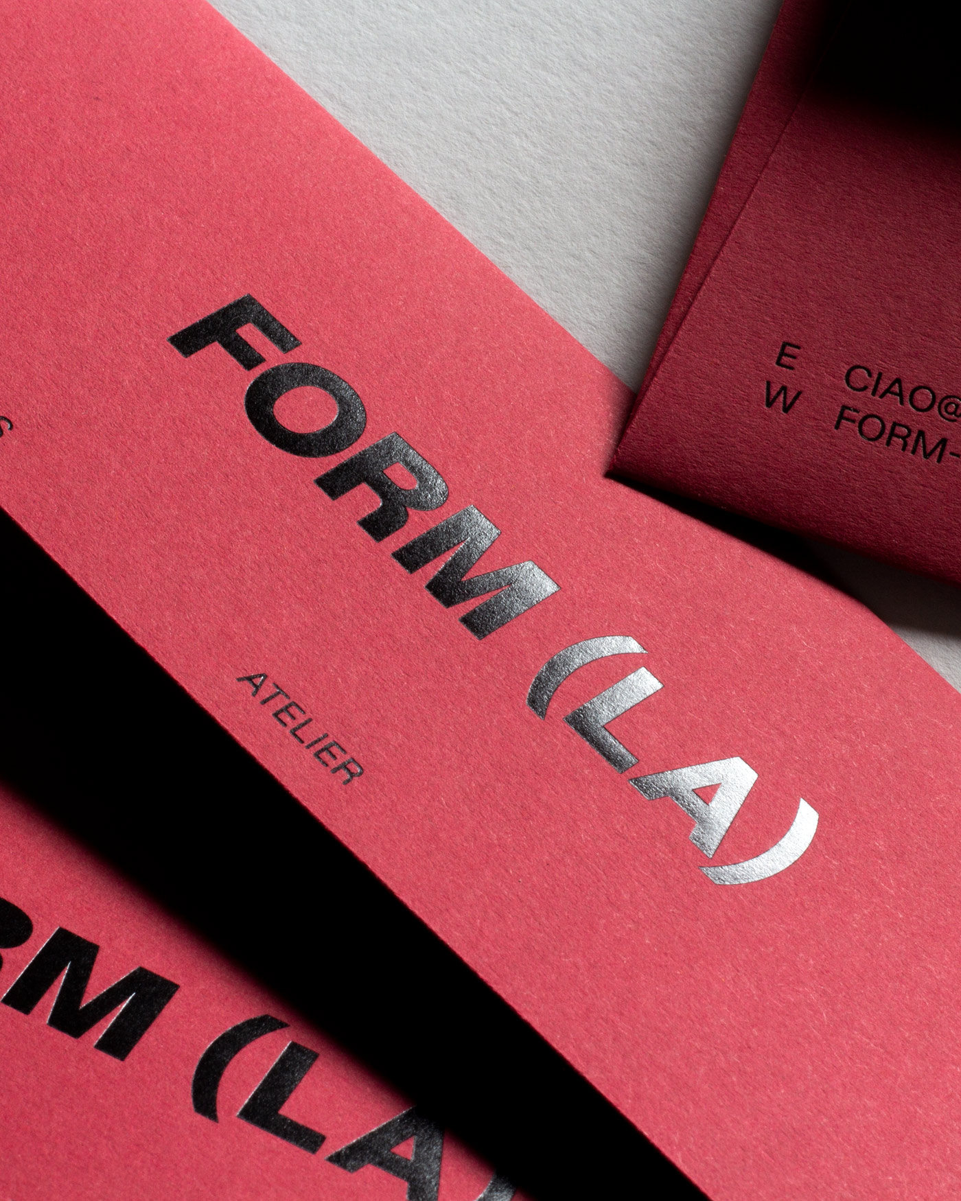 Studio Sly. The notecards featured a sculptural domed foil emboss logo and were die cut to reflect the shapes found in Form LA’s custom stone ware.